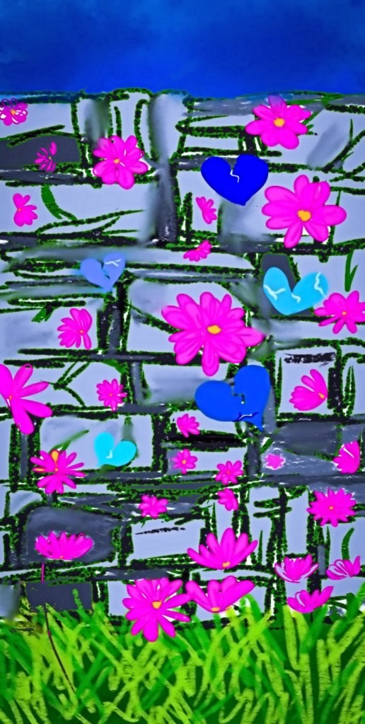 Then, they saw the love hearts on the wall. And it made their own hearts sink. The wall hearts were all bruised and broken in some way, all in different shades of blue reaching into lilac and back. The love hearts appeared, swung, danced and perched fearfully before disappearing and reappearing.