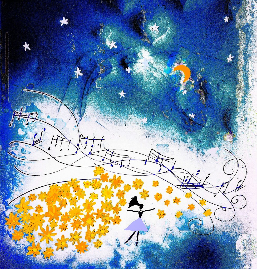 Here, she couldn’t be seen. Here, she could only see the flowers, the sky of ocean-nights, the stars. Here, the music and its rhythms came flowing over to her.